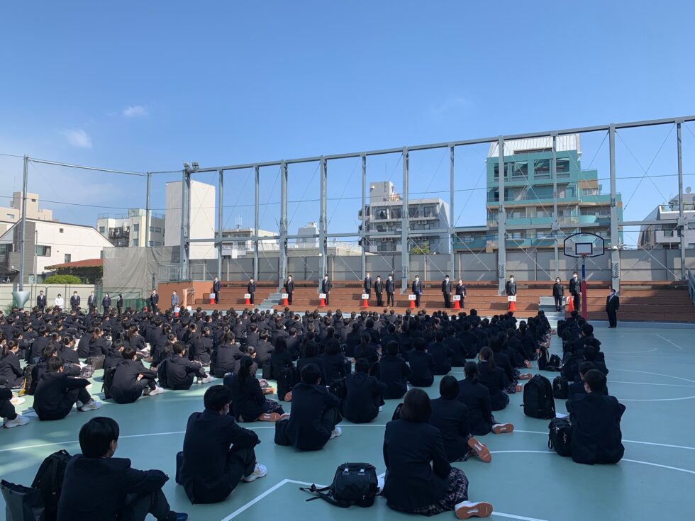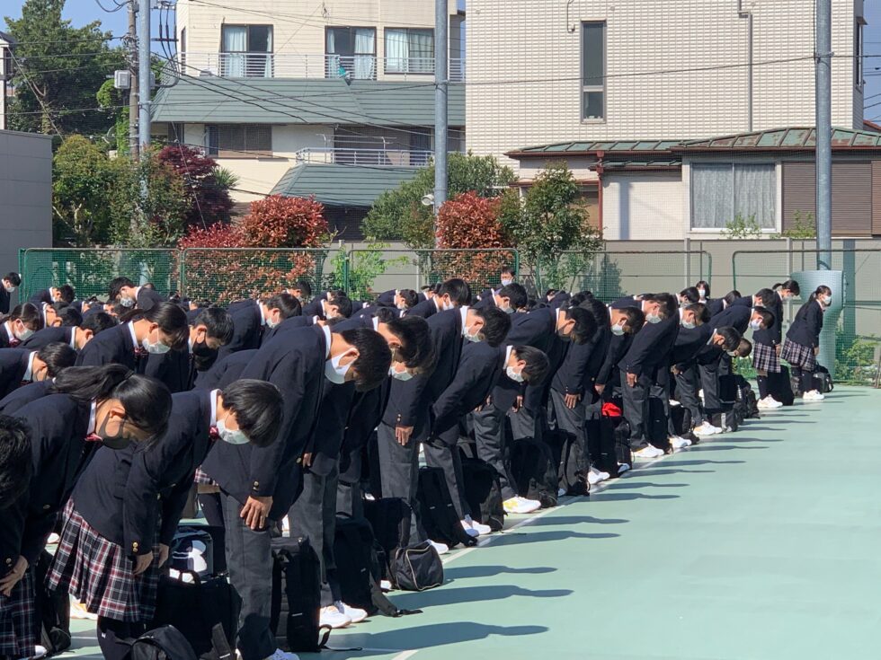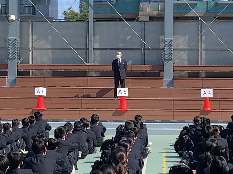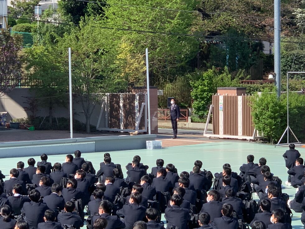 校庭でクラスに分かれて整列、勝又校長から学年主任、クラス担当の教諭、学年付き教諭陣が紹介されました。続いて本田先生から『堀越精神』のひとつであり、本校が大切にしている“礼”の作法について指導がありました。