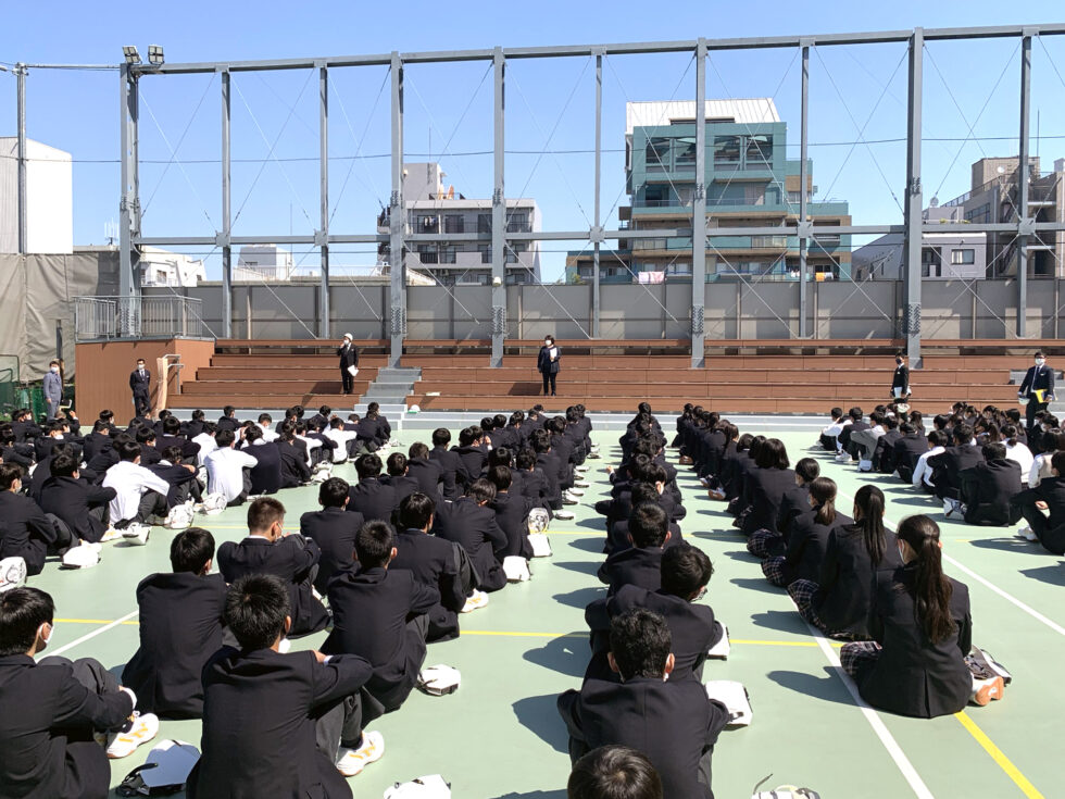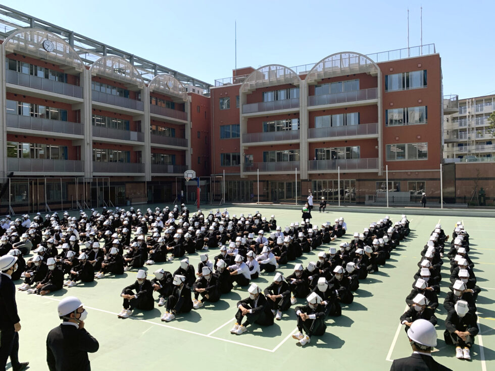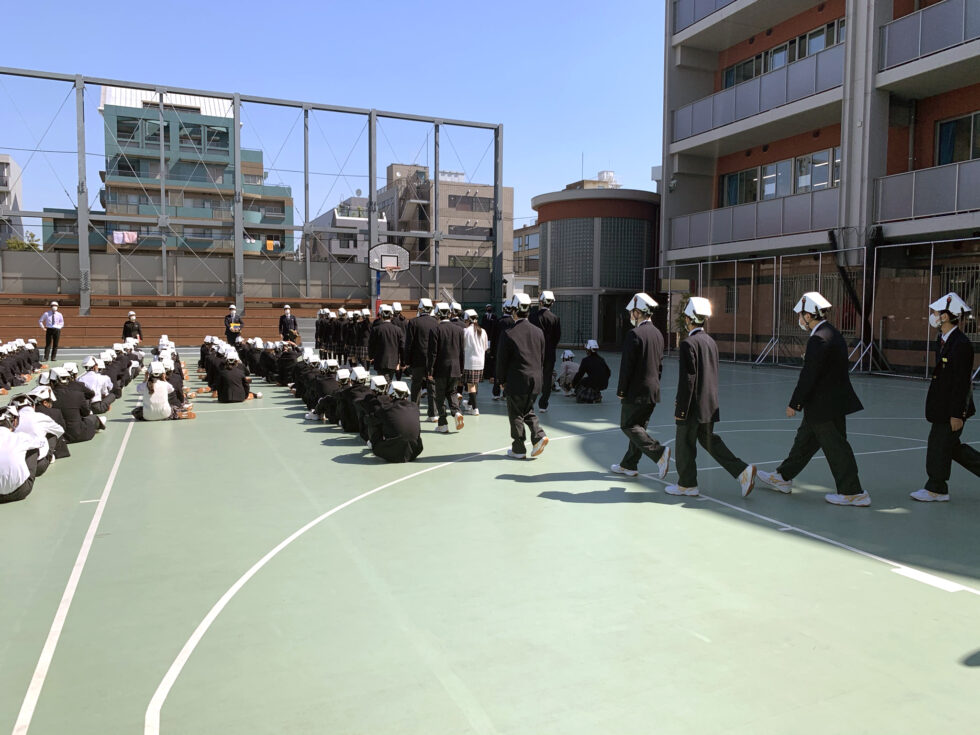 9月に防災訓練を実施する学校が多いと思いますが、本校では新入生が少しでも早く、校内の避難経路を認識するために、4月に防災訓練を実施しています。今日の訓練の様子を見て、1年生は冷静に、無口で、迅速な行動をとっていました。素晴らしかったです。本校の校舎は、大きな地震にも耐える免震構造のため、地震だけであれば校内にいたほうが安全です。しかし火災発生時には、校庭へ避難します。その判断や避難行動を的確にとらえ行動することがとても大切です。生徒全員の命を守るために、一人ひとりが本日の訓練を忘れず、万一のために心の準備をしておきましょう。