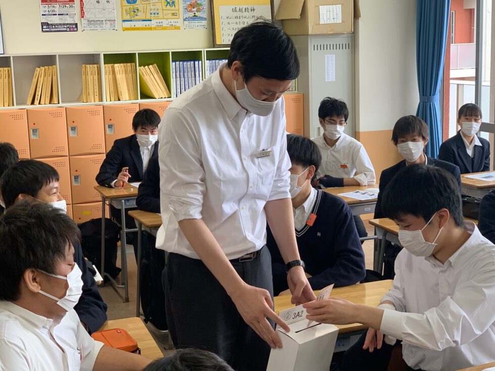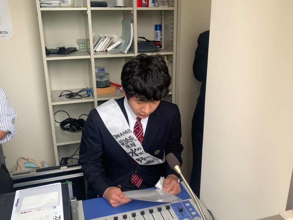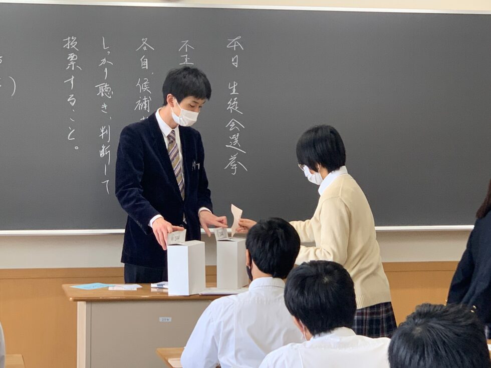 令和3年度 前期生徒会選挙には、生徒会長に2名、副会長に4名が立候補。4月28日から選挙運動が開始され、5月12日に校内放送で演説会、そして投票が行われました。