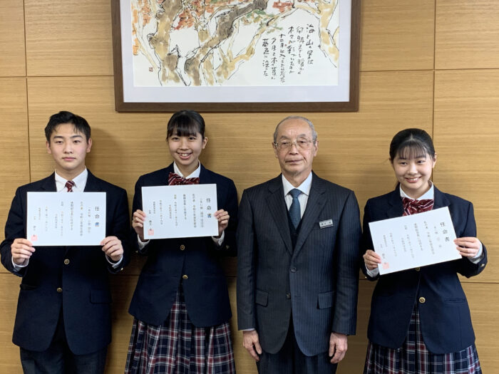 投票の結果、生徒会長に2年福本、副会長に2年山下と1年小泉が選ばれました。19日に任命式が行われ、勝又校長から任命書が手渡されました。