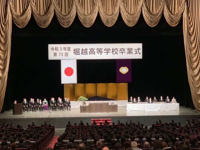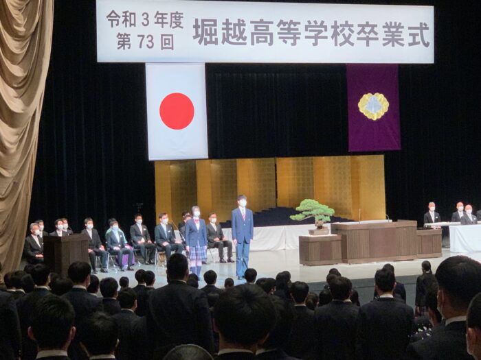 今年4月、民法が改正され成年年齢が20歳から18歳に引き下げられます。成人になるという事は、自分の意志で様々な契約が出来る、資格取得が出来る等、今までできなかったことが出来るようになります。反面、守られてきたことが自己責任となる。名実ともに大人になるということです。一つひとつ大人の階段を上ってください。その先には輝かしい未来が待っています。皆さんが堀越高校で学んだことは、大きな力になります。校訓「太陽の如く生きよう」、堀越精神を忘れず、社会に出て活躍してください。人生は、勝ち負けではありません。心の持ちようで視界は変わります。周りの人を支え、周りの人に支えられ、優しい人になってください。優しい社会の担い手になってください。