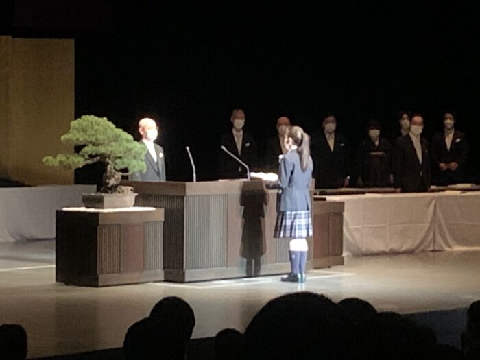 続いて、堀越正道理事長から祝辞。在校生から卒業生へ感謝の言葉が贈られました。祝辞を受けて、卒業生代表の柿島彩さんが登壇。高校生活の思い出を振り返り、先生方や保護者への感謝の気持ちを込めてお礼の言葉を伝えました。