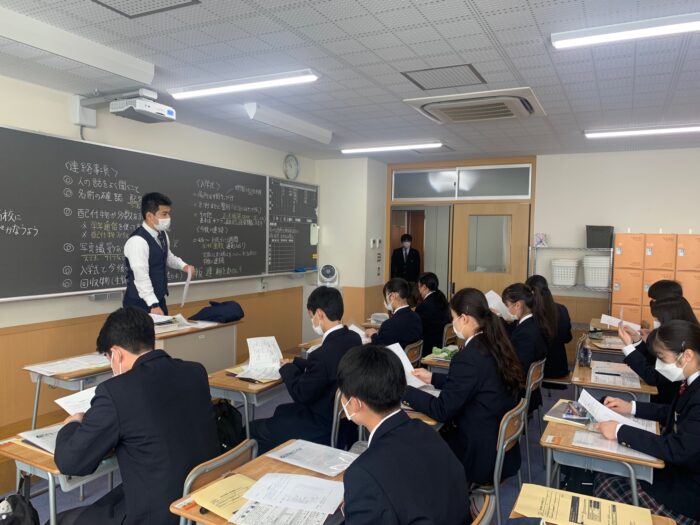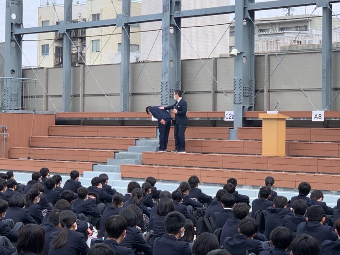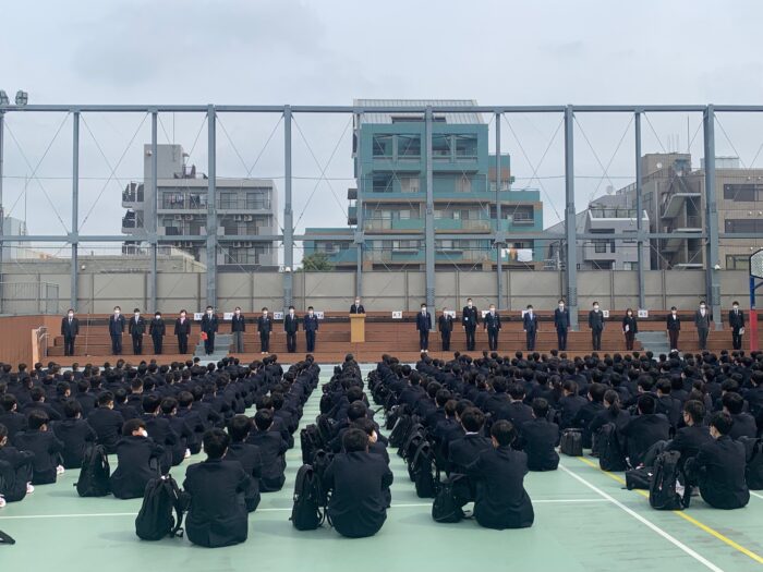 4月6日(水)、真新しい制服に身を包んだ新入生が登校しました。校庭でクラスに分かれて整列した生徒たちに、掛本学校長から学年主任、クラス担当の教諭、学年付教諭陣が紹介されました。続いて吉田先生から『堀越精神』の一つであり、堀越高校が大切にしている“礼”の作法について指導がありました。新入生の皆さん、あいさつ・身だしなみは、しっかりと身に付けましょう。その後、教室へ移動。担任教諭の自己紹介、入学式と来週の予定等の注意事項、証明書撮影を行い下校となりました。
