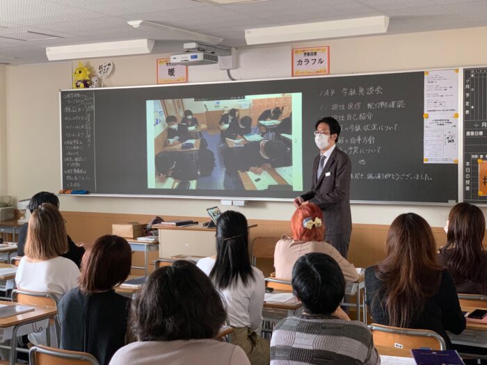 1年生の全体会では学年主任の坂本先生から学年目標「暖(だん)」、学年指導方針「1学年OGプロジェクト」の説明と共に「我々教員の喜びは、生徒が楽しいと言って学校に通ってくれること、そして生徒の成長を感じることです。これは、保護者の皆様もご一緒ではないでしょうか。我々は、全力で生徒が安心して楽しく通える環境を作ります。保護者の皆様も本校の教育にご理解・ご協力いただきながら、子供の成長を見守ってください」と挨拶がありました。