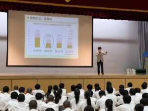 当日は、大原情報ビジネス専門学校入試相談室の小沼様をお招きして「近年の就職状況全般について」「就職対策と日々の学校生活」「公務員の仕事とは 公務員試験に向けての対策」という3つのポイントを講義していただきました。2年生の6月という時期は、進学や就職に対して実感できていない生徒が多いようですが、そろそろ自分の将来を考える時期にきています。今後は専門学校や大学のキャンパス訪問など、様々な進路体験学習を用意しています。実際に、聞いて・見て・体験して、自分に合った進路を見つけてほしいと思います。