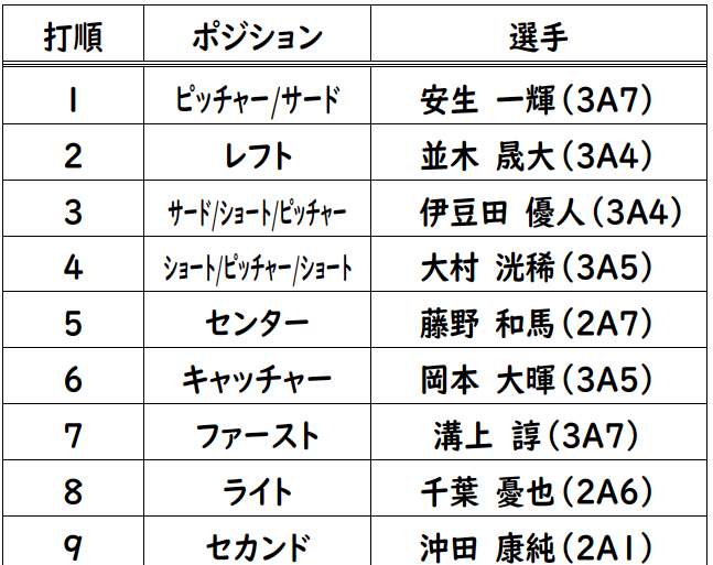 2回に6番岡本(3A5)がライトへの3塁打で出塁し、内野ゴロの間に生還。1点を先制するも、8回に逆転を許し、迎えた9回表。5番藤野(2A7)の左 中間への本塁打で同点とし、延長戦へ。