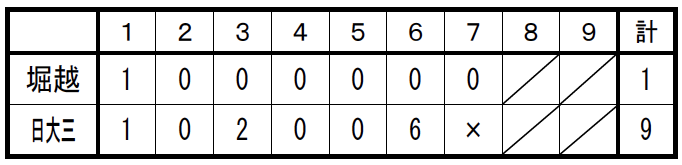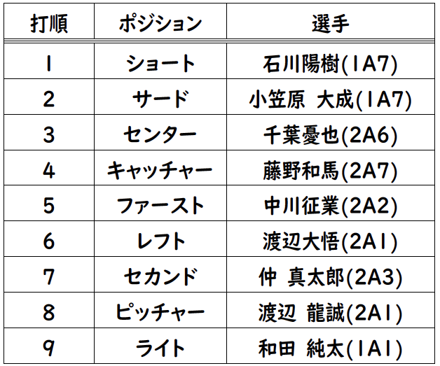 1回表、先頭打者の石川(1A7)が初球を右中間へ一 返し、3塁打とする。続く2番・小笠原(1A7)がフルカ ウントからセンター前にヒットを放ち、1点先制。しかし、 この1点にとどまり、守備ではエラーが多く出てしま い、7回コールドで初戦敗退。