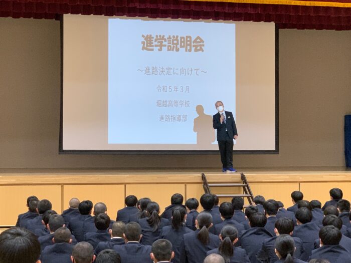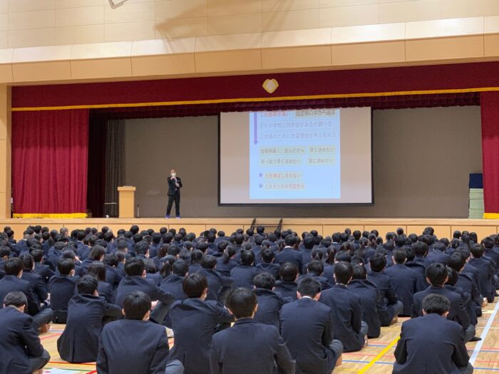 続いて、進路指導部長の和田先生による「進学説明会 ~進路決定に向けて~」が行われました。生徒たちを取り囲む社会環境の変化、大学・短大・専門学校の状況、大学入試の選抜方法、進路決定までのスケジュールなど、目の前に迫った進路決定に向けてお話がありました。「志望理由をしっかり伝えられるようにする。進路先での学びについていけるように勉強する。この2つは、特に大切です。将来、自分は何を学びたいのか、どんな職業に就きたいのか。自分自身の将来の事は、自分で考え、気づき、行動し、自分で決めなければいけません。夢と希望と覚悟を持って、前へ進んでください。」