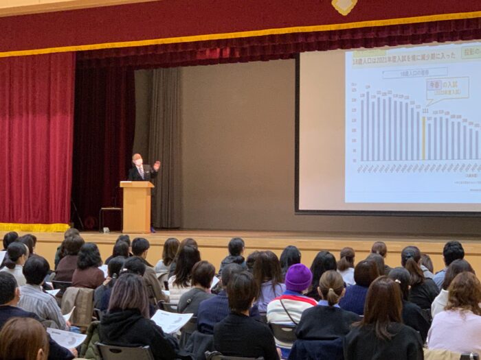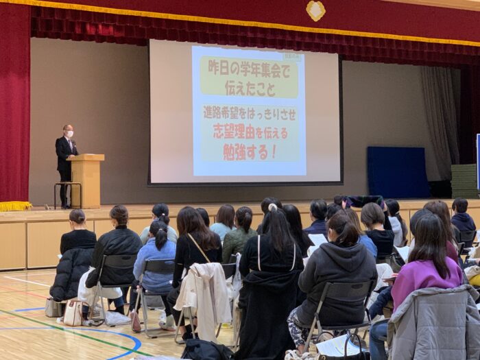 まず、体育館で進路指導部長の和田先生による説明会が行われました。大学・専門学校の状況、大学入試の選抜方法、進路決定までのスケジュールなどの概要説明、“生徒が自分の将来と向き合うことの大切さ”をお話しました。そして、「生徒たちは、4月に入ると担任・進路指導部教諭と進路についての個人面談を行います。保護者の皆様には、春休みの期間を利用して生徒と進路について話をしてください。生徒は、自分がやりたいと思うことが見つかれば、頑張れます。生徒が学びたいこと(就きたい仕事)を探し、気づき、前へ進むことが出来るようにサポートをお願いします」とお話がありました。
