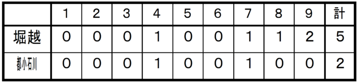 6番・平野が右中間に2塁打を放ち、9番・小笠原 大成(2A7)が四球を選んで2死1・2塁とすると、1番・石川が右中間に2塁打を放ち2者生還。2点追加。