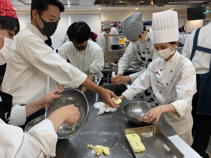 5月18日、ライフデザインの3回目の授業が行われ、「調理実習 ~家庭にあるもので高級料理店の味を再現しよう~」を受講する生徒33名が織田学園を訪れ、調理実習室でバター作りに挑戦しました。織田学園の桑原先生とアシスタントの2名の方の指導の下、生クリームをボールに取り、ホイッパーで撹拌。完全に分離したら水で洗い、布で軽く水分を取り、再び練り直した後、ラップに包み、冷蔵庫で冷却。生徒たちは、なかなか固まらない生クリームに苦戦しながらも先生やアシスタントの方に工程を確認しながら、バターを完成させました。できあがったバターは、各自、お土産として持参しました。