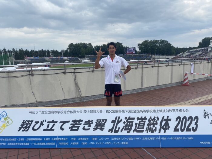 全国大会が、厚別公園陸上競技場で開催されました。本校からは円盤投で古家(3C2)が出場しました。この全国大会に出場するまでに、支部大会、都大会、関東大会を勝ち上がり、やっとの思いで全国大会まで来ることができました。全力で挑んだ円盤投でしたが、やはり全国大会の壁は厚く、また、自己記録を更新することもできず、予選敗退で全国インターハイが終わってしまいました。しかし、円盤投げを始めてから約1年間で、よくここまで結果を残せたと思います。本人はとても悔しい思いをしましたが、この経験が古家の今後の成長に大きく影響すると思います。今大会で得た課題や反省点を後輩たちに伝え、チームのパワーアップにつなげたいと思います。全国インターハイを終えて、チームは既に新体制となり次の大会に向けて再出発しています。これまでたくさんのご支援、ご声援を賜りまして誠にありがとうございました。
