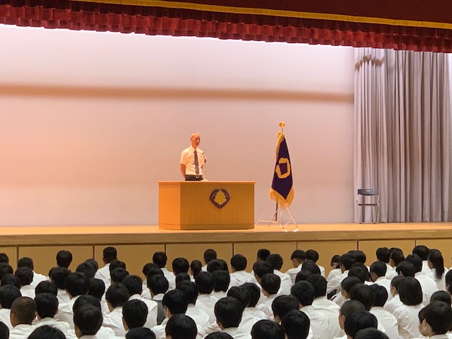 始業式の後、本田先生から夏季休暇中の部活動報告。ダンス部が「第35回全日本高校大学ダンスフェスティバル神戸」で準入賞を受賞。陸上競技部の古家君がインターハイ(全国高等学校陸上競技大会)に出場。円盤投げで33m70cmの記録を残しました。ダンス部と古家君に大きな拍手が送られました。