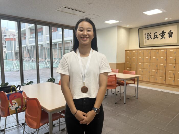 卒業生の倉鹿野さんがアルティメット世界大会3位 トピックス 2023/09/15 令和2年度卒業生の倉鹿野南鼓音さんが、今年7月にイギリスで行われた「WFDF2023世界U-24アルティメット選手権大会 ミックス部門」で銅メダリストに輝きました。 9月15日、倉鹿野さんが銅メダルを持参して、報告と挨拶のために来校してくれました。 前の記事へ 一覧に戻る 次の記事へ