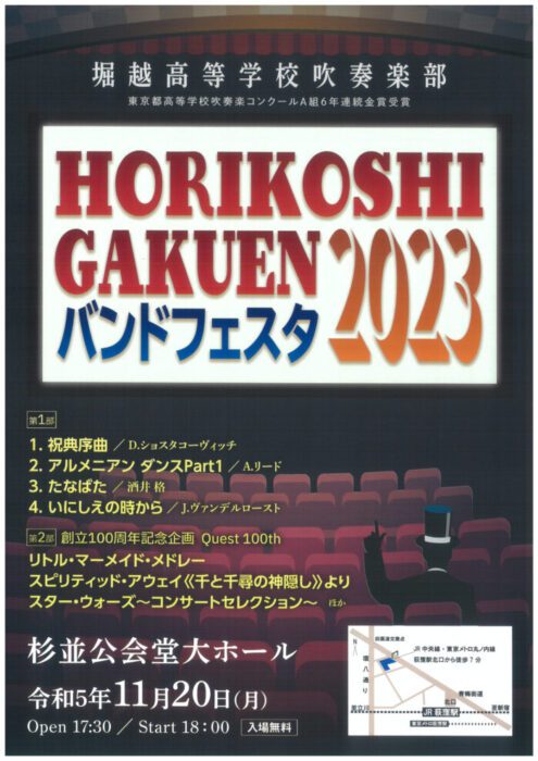 第1部はクラシック作品を中心に、第2部は映画音楽を中心に堀越学園創立100周年記念を祝した「Quest 100th」の企画を行います!お楽しみに!
