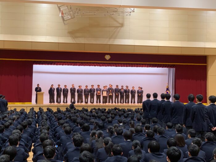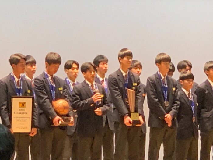 始業式後に冬季休暇中の部活動結果報告。応援歌が流れる中、全校生徒の拍手に迎えられてサッカー部が登壇しました。第102回全国サッカー選手権大会(3842校出場)に於いて、本校サッカー部が歴代最高の全国第3位の成績を収めました。さらに大会優秀選手にGK吉富柊人、DF森 奏、FW中村健太の3名が選ばれました。キャプテンの中村くんから「たくさんの応援をありがとうございました。皆さんの声援が力になりました。堀越高校サッカー部として全国3位という結果を残すことができたことはとても嬉しく思います。しかし優勝できなかったという悔しさもあります。今後のサッカー部に期待してください、そしてこれからも応援をよろしくお願い致します」と挨拶がありました。