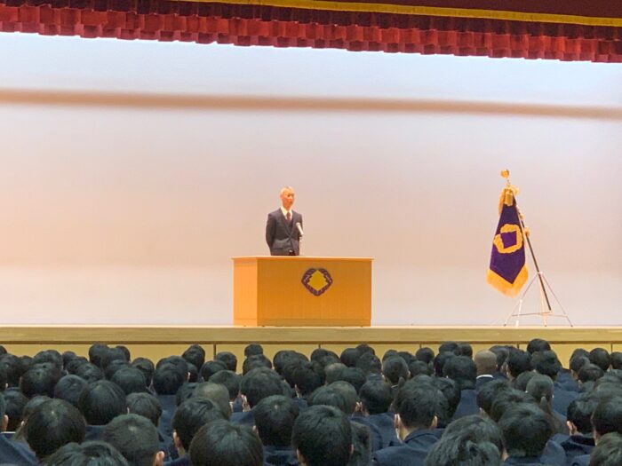全校生徒が体育館に集合。校歌斉唱後、掛本学校長から式辞がありました。
