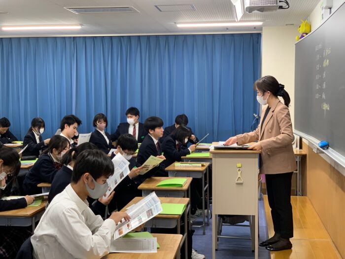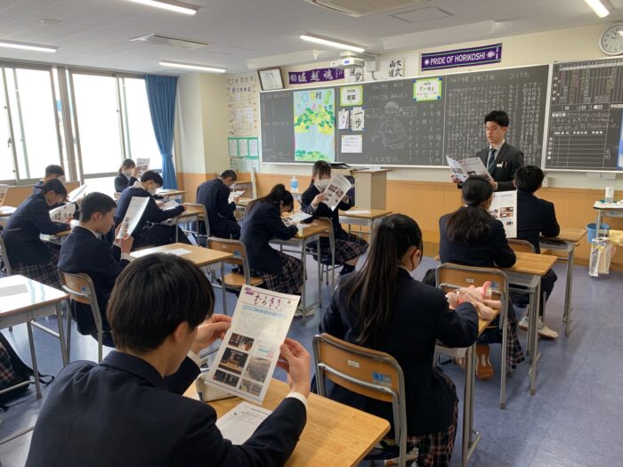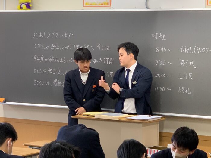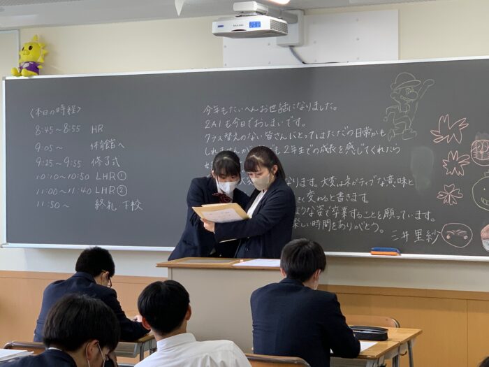 修了式は校歌斉唱後、掛本学校長から式辞がありました。修了式後は各クラスに戻りロングホームルーム。担任教諭から一人ひとりに成績表が手渡されました。そして、同じクラスで1年間を過ごした仲間との別れを惜しむ時間となりました。