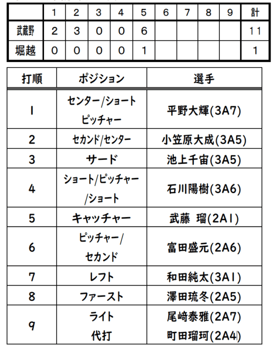 5回の1得点…5番武藤(2A1)のセンター前ヒット、6番富田(2A6)の四球、さらにワイルドピッチが重なり2死2,3塁とし、8番澤田(2A5)のセンター前ヒットにより1点を返す。
