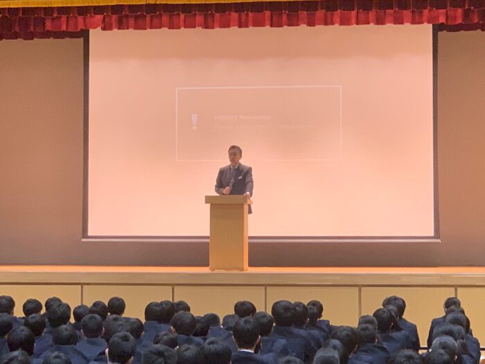 続いて生徒指導部長の山口先生から「堀越高校は、SNSの問題を重要に考えています。特に“いじめ”に関しては厳しく管理・指導しています。SNSの危険性を再認識してください。そして適正に賢く利用して有意義な高校生活を送ってください」とお話がありました。