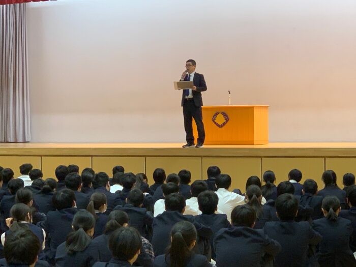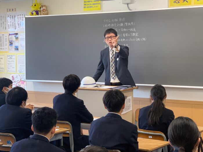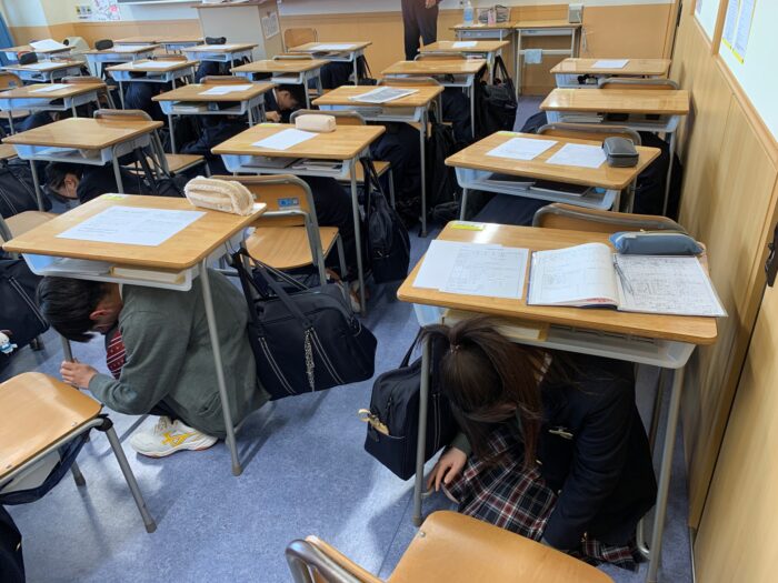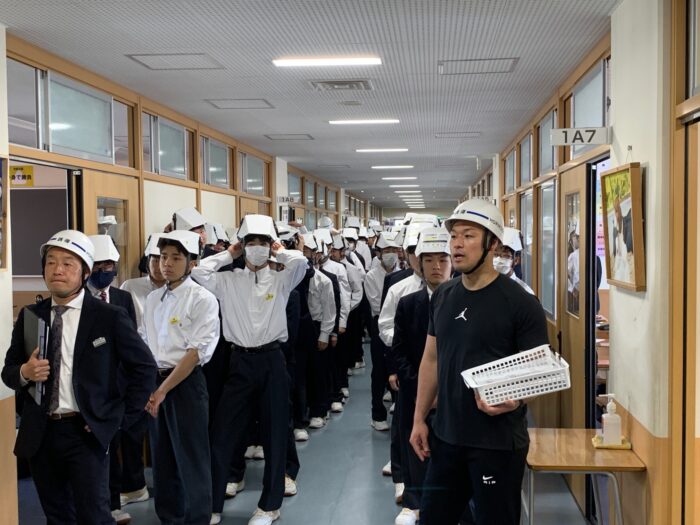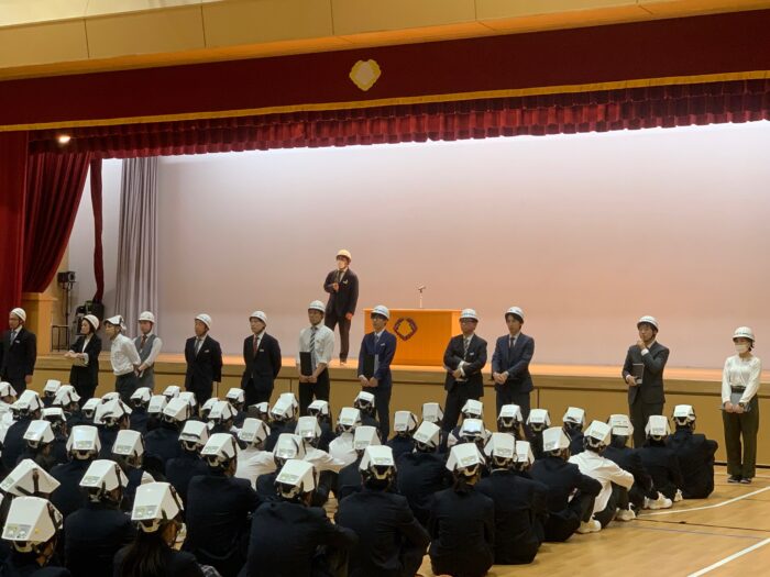 19日(金)、防災訓練を行いました。堀越高校では入学して間もない1年生が避難経路を認識するために、4月の上旬に防災訓練を行ないます。当日は、9時10分から全校生徒が各クラスに分かれて①学校安否情報について ②避難場所・広域避難場所の確認 ③通学路調査の指導を受けました。9時25分、地震発生を知らせる非常サイレンが鳴り、生徒たちは机の下に避難。(第一次避難)その後、理科室から火災発生の放送があり、1年生はヘルメットを着用して体育館へ避難(第二次避難)を行いました。体育館に集まった1年生には校務・防災危機管理部部長の斎藤先生から「本日の避難訓練は静かに、速やかに、慌てることなく行動することができました。日本は地震が多く、いつ大きな地震に襲われるかわかりません。本日の訓練を忘れることなく、万一の時には命を守る行動をとってください」とお話がありました。