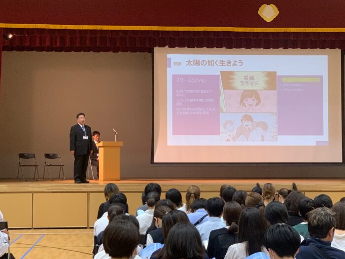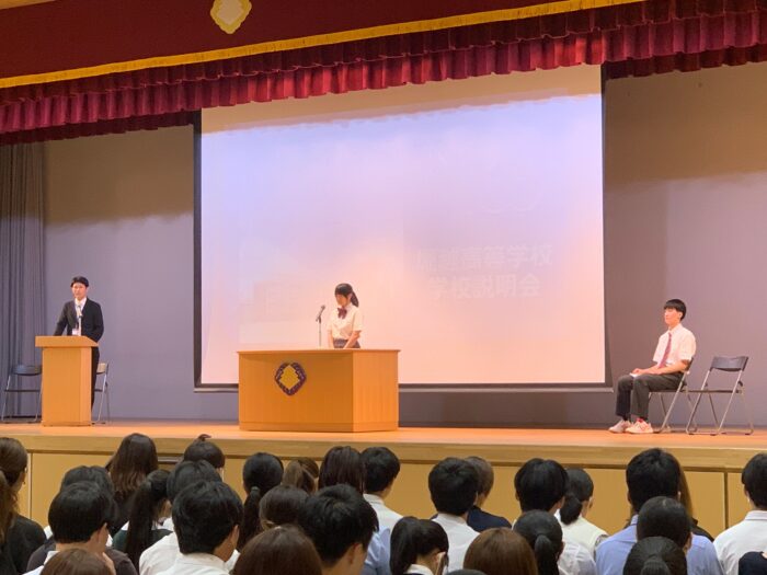 続いて在校生が登壇。総合コース代表生徒は、生徒と先生の距離が近く安心して学校生活を過ごすことができる。中学時代と比べて自分に自信が持てポジティブになれた。印象的な学校行事は文化祭。など、学校の魅力を語ってくれました。体育コースの代表生徒は、男子バスケットボール部で特技の3ポイントシュートを披露してくれました。