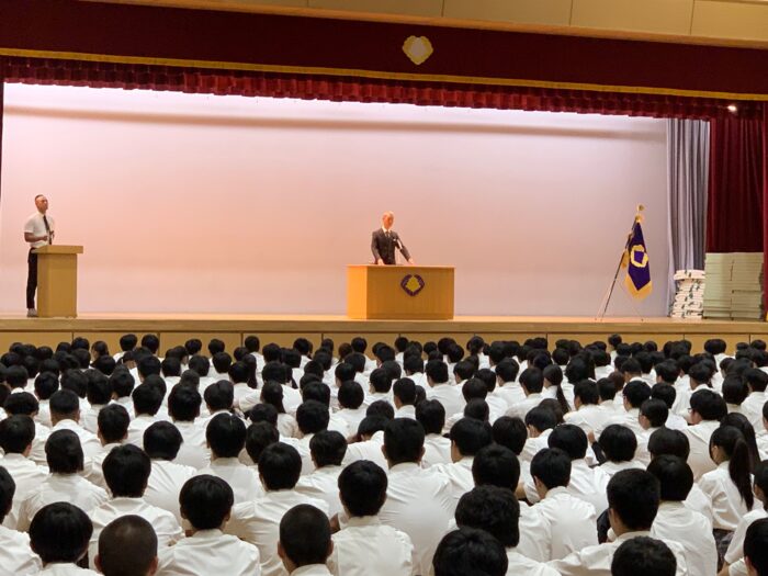 19日(金)、令和6年度 第1学期の終業式を行いました。全校生徒が体育館に集合。校歌斉唱後、掛本学校長から式辞がありました。