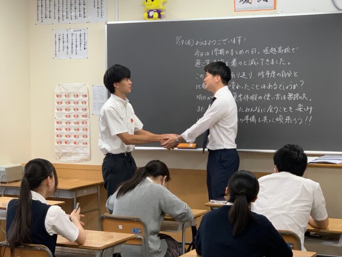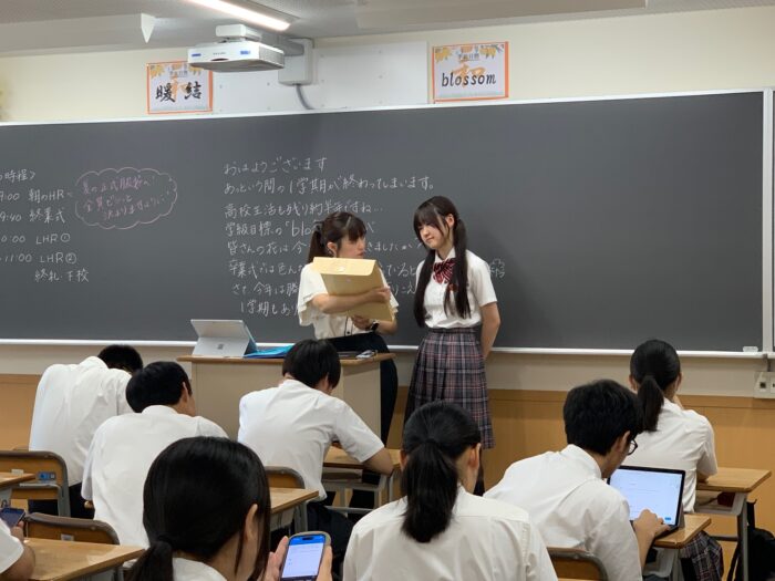 その後、教室に戻りロングホームルーム。夏休みの諸注意と各種書類の配布、担任教諭から生徒一人ひとりに成績表が手渡されました。