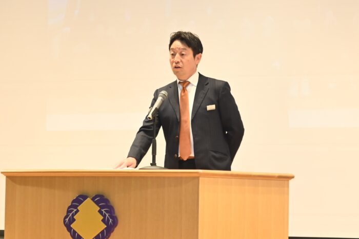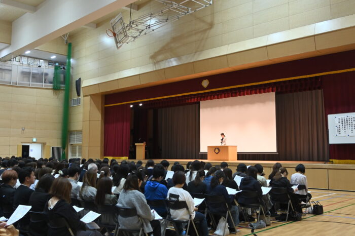 体育館で行われた全体保護者会では、学年主任の田中先生が挨拶。続いて教務部長の柿沼先生から朝学習の取り組み、検定試験への挑戦推奨の話がありました。生徒指導部長の山口先生からは生活習慣の確立について、SNSの利用に関する注意事項、そして生徒たちが社会を生き抜く力を育むために“お礼と謝罪”を速やかに言葉にできる習慣を身につけさせましょう、と話がありました。