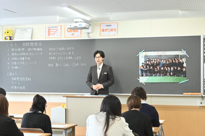 各HR教室に移動して開かれた学級懇談会では担任教諭の自己紹介、学級目標、指導方針、クラスでの生徒の様子などの話がありました。