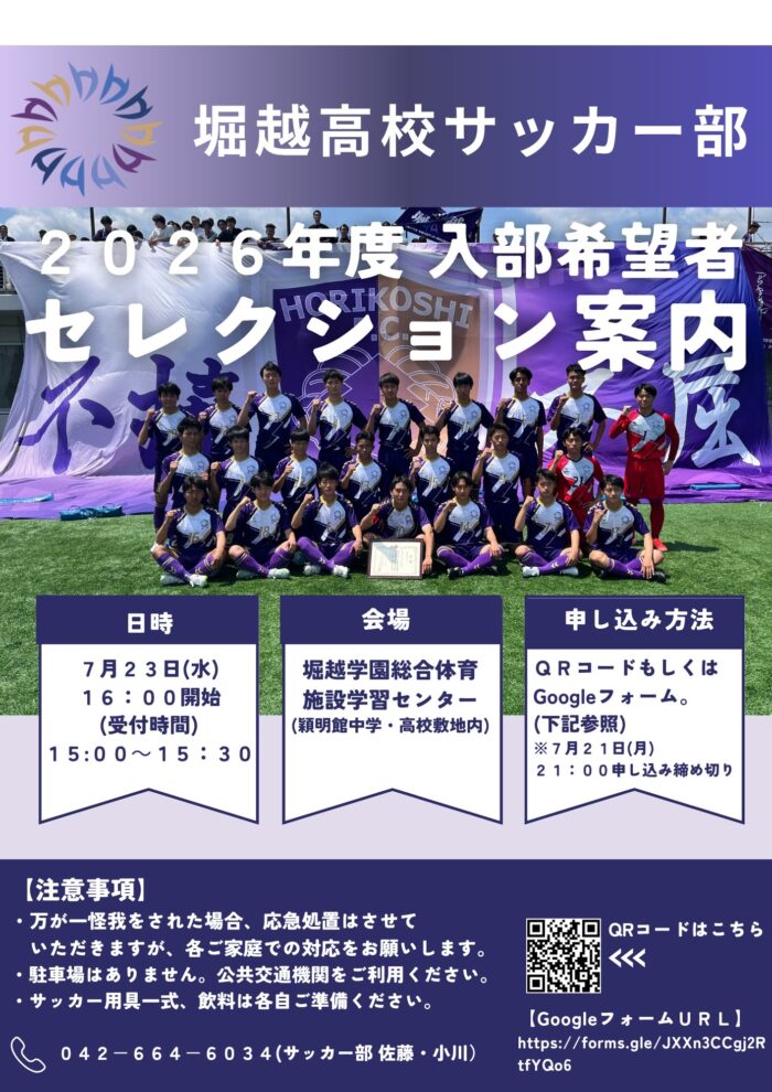 堀越の日常 2025/06/27 令和8年度、サッカー部入部希望者のためのセレクションの実施要領です。QRコードを読み込むか、Googleフォーム(URL)から必要事項を記入して申し込みを行ってください。また、当日は気温が高くなる可能性があります。サッカー用具の一式だけでなく、飲み物(グラウンドでは水かお茶のみ)を持参してください。よろしくお願いします。 前の記事へ 一覧に戻る 次の記事へ