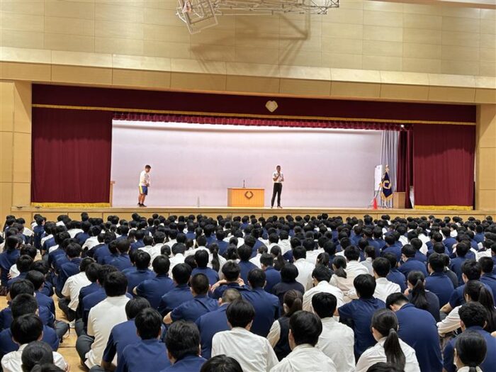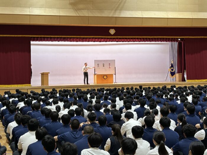 9月18日(木)、全校朝礼を行いました。体育館に全校生徒が集まり、校歌斉唱の後、生徒指導部長・山口先生より講話がありました。講話では、京セラやKDDIの創業、JALの再建など、経営者として数々の偉業を成し遂げた稲盛和夫氏の哲学が紹介され、「ありがとう」「すみません」「おかげさま」という5文字のキーワードを大切にして生活してほしい、との話がありました。