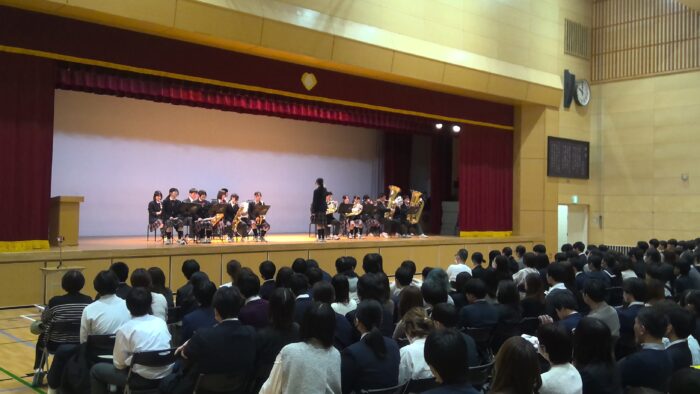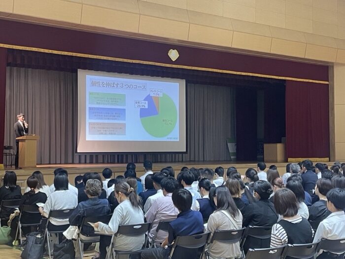 体育館での全体会は、吹奏楽部による演奏セレモニーから始まり、会場が温かい雰囲気に包まれました。全体会の後は、校内見学や個別相談を実施し、それぞれのブースで熱心に質問や確認をしていただく姿が見られました。