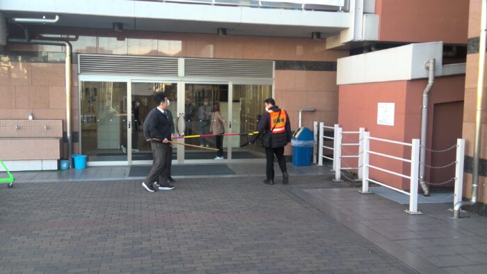 12月5日(金)、中野警察署の方にご来校いただき、防犯訓練を行いました。今回は、不審者が学校に侵入した場合を想定し、校舎外で対応するケースと校舎内で対応するケースの2種類の訓練が行われました。