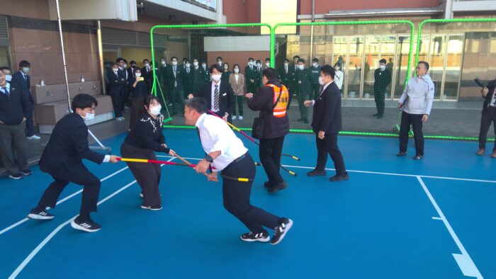 また、教員による刺股(さすまた)・木刀を用いた制圧行動も確認し、緊急時の役割分担や距離の取り方など、具体的な動きを訓練しました。訓練終了後は中野警察署の方より講評とアドバイスをいただき、教職員一人ひとりが意識を高める貴重な機会となりました。
