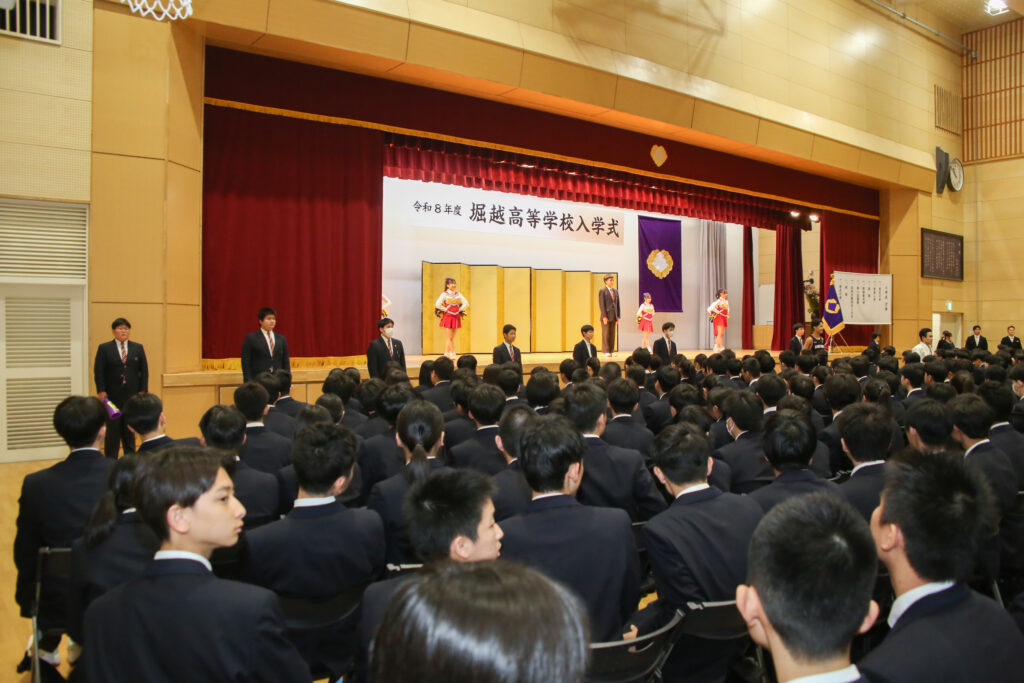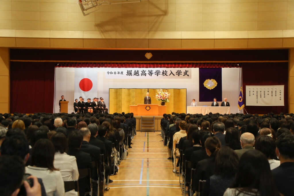 当日は多くの保護者の皆様にご参列いただき、式終了後には校庭に設置された「令和8年度堀越高等学校入学式」の看板前で、晴れやかな表情の記念撮影が行われました。校門では、本校マスコットキャラクター「ホリオン」も登場し、新入生の門出を温かく祝いました。