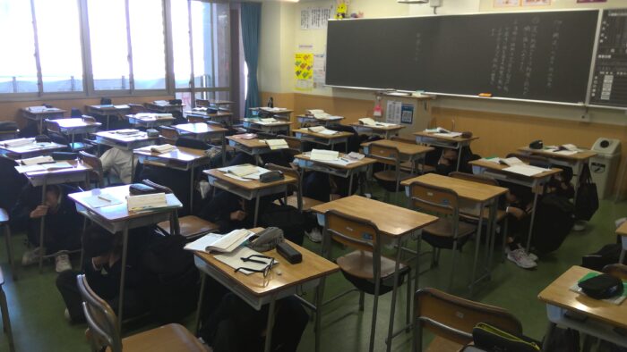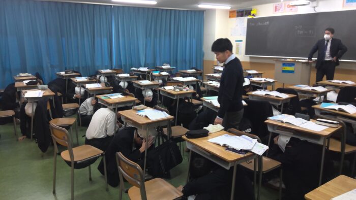 9時30分、校内に非常サイレンが鳴り響き、緊急放送が流されると、生徒たちはすぐに机の下にもぐり、身の安全を確保しました。