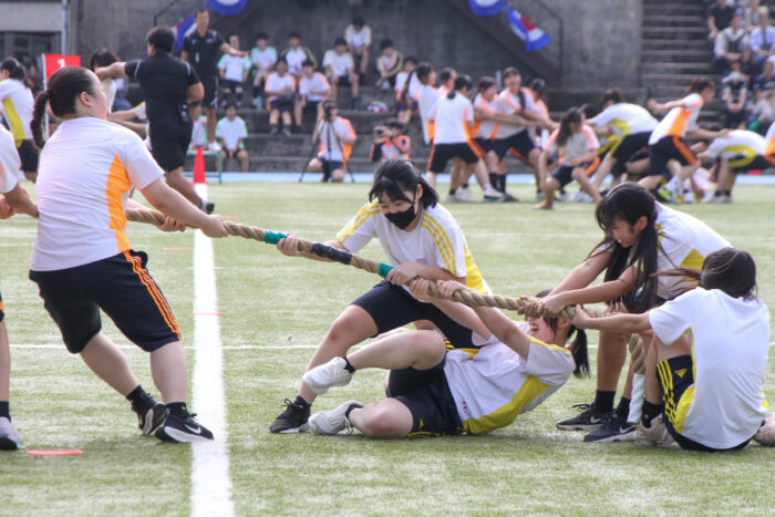 学年対抗の真剣勝負。昨年度、総合優勝を果たした現3学年に連覇の期待がかかる中、各学年が一致団結し、熱戦を繰り広げました。競技だけでなく応援にも力が入り、団結力を感じる見ごたえのある体育祭となりました。