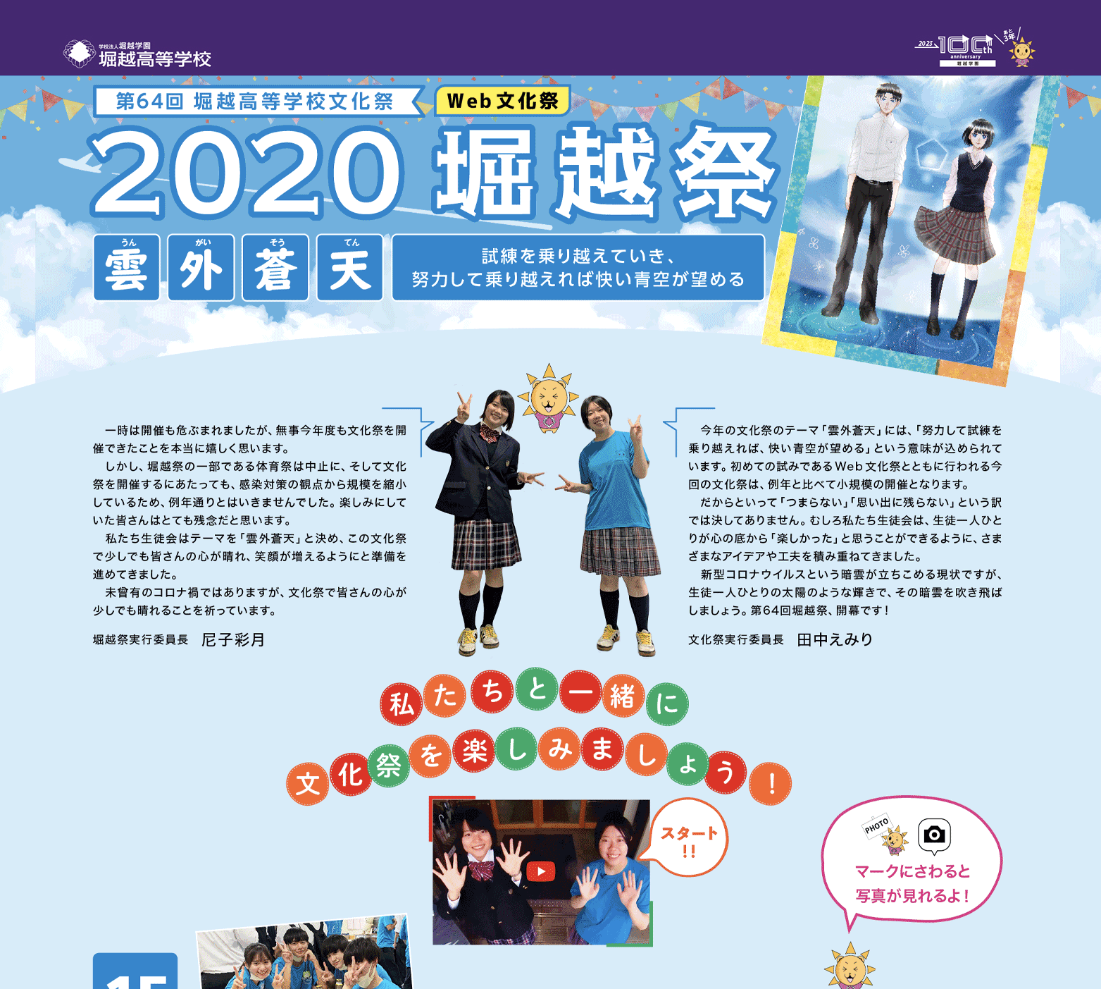 コロナ禍の中、2020年のWEBで実施した堀越祭のホームページのイメージです。画像をクリックすると当時のポスターや動画が視聴できます。