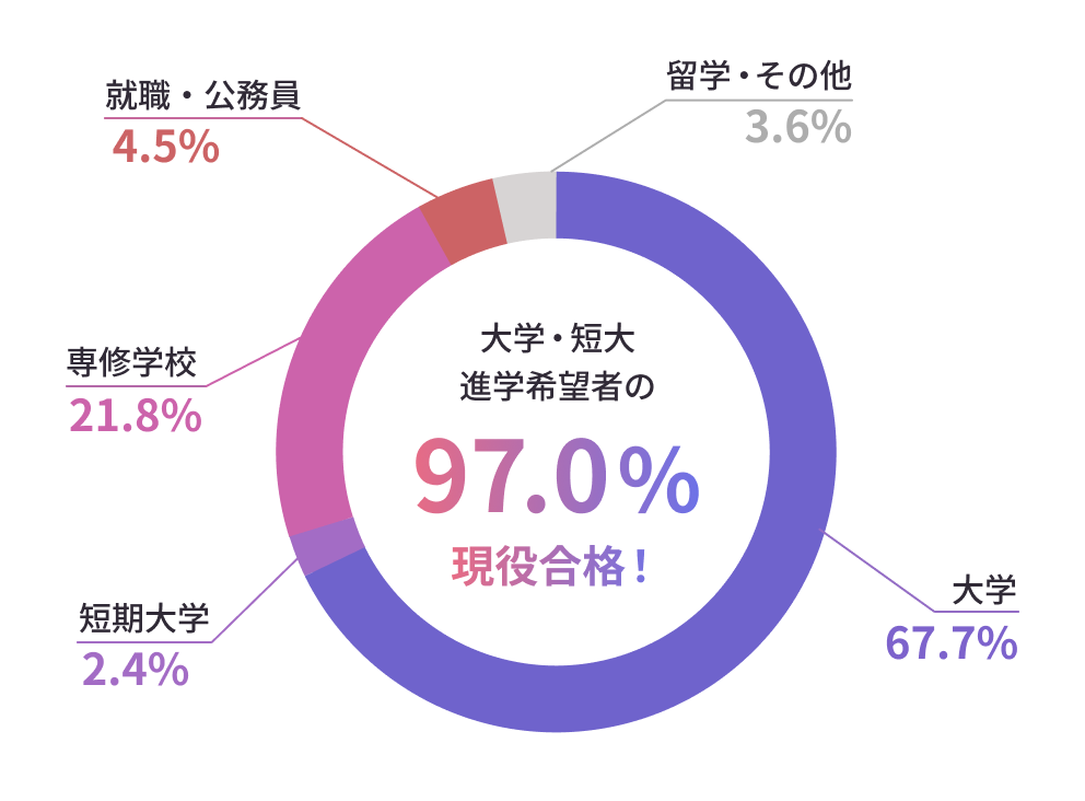 令和6年度の卒業生は、大学・短大への進学希望者232名のうち225名が現役で合格。目標に向かって努力した先輩たちは、胸を張り、夢に向かって歩き出しました。
